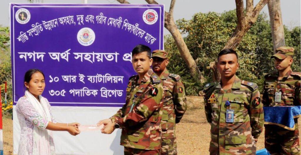 রাঙামটি রিজিয়নের অধীন পরিচালিত কাপ্তাই ১০ আর ই ব্যাটালিয়নের উদ্যোগে অসহায় গরীব মেধাবী শিক্ষার্থীদের মাঝে নগদ অর্থ বিতরণ করা হয়েছে। রবিবার ব্যাটালিয়ন সদর দপ্তরে ব্যাটালিয়নের দায়িত্বপূর্ণ এলাকার অসহায়, দুস্থ মেধাবী ১৬ শিক্ষার্থীর মাঝে নগদ অর্থ বিতরণ করা হয়।