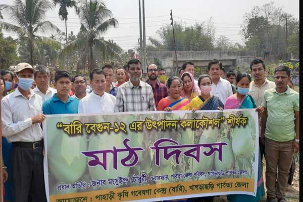 মাঠ দিবসে ‘পাহাড়ি কৃষি গবেষণা কেন্দ্র (বারি)’-এর উদ্ভাবিত ‘বারি বেগুন-১২’ জাতের কৃষক পর্যায়ে উন্মুক্ত করা নিয়ে আলোচনা হয়।