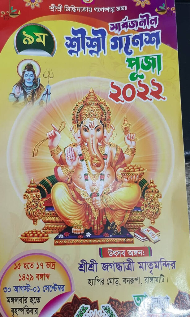 শ্রীশ্রী গণেশ পূজা উপলক্ষে রাঙামাটি শহরে জগদ্ধাত্রী মন্দিরে সূর্য উদ্যোগ সংঘের উদ্যোগে প্রতি বছরের ন্যায় এবছরও নানান মাঙ্গলিক অনুষ্ঠানের আয়োজন করা হয়েছে। মঙ্গলবার থেকে বৃহস্পতিবার পর্যন্ত তিন দিনব্যাপী নানা অনুষ্ঠানের আয়োজন করেছে সংগঠনটি।