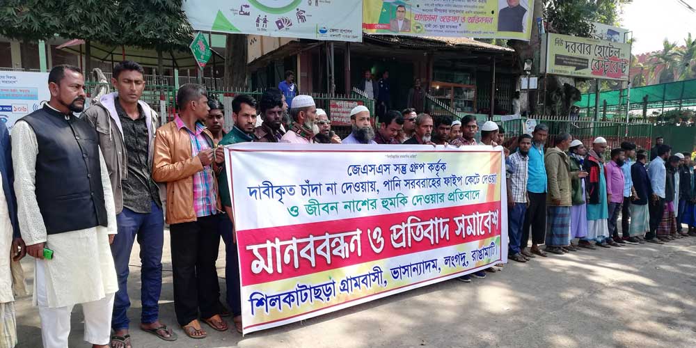 রাঙামাটি জেলার লংগদু উপজেলার ভাসান্যাদম ইউনিয়নের শিলকাটা ছড়া গ্রামে সুপেয় পানি সরবরাহ কাজে দাবিকৃত চাঁদা না দেয়ায় পানির লাইন কেটে দেয়া ও জীবননাশের হুমকির প্রতিবাদে মানববন্ধন অনুষ্ঠিত হয়েছে। বুধবার সকালে শিলকাটাছড়া এলাকাবাসীর ব্যানারে জেলা প্রশাসক কার্যালয়ের সামনে ঘন্টাব্যাপি এ মানববন্ধন অনুষ্ঠিত হয়।
