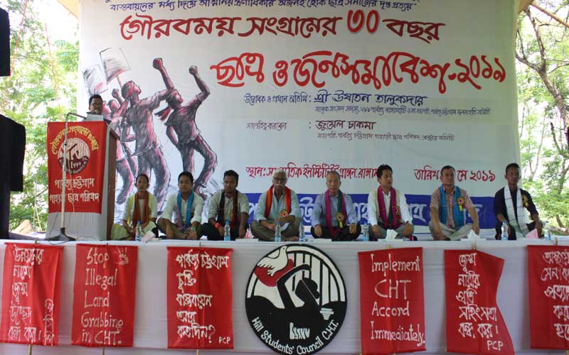সোমবার সকালে পার্বত্য চট্টগ্রাম পাহাড়ি ছাত্র পরিষদের (পিসিপি) ৩০তম প্রতিষ্ঠাবার্ষিকী ও ছাত্র-জনসমাবেশে প্রধান অতিথির বক্তব্য তিনি এ আহ্বান জানিয়েছেন। রাঙামাটি ক্ষুদ্র নৃ-গোষ্ঠী সাংস্কৃতিক ইনস্টিটিউট মাঠ প্রাঙ্গণে পিসিপির প্রতিষ্ঠাবার্ষিকীর এ সমাবেশ অনুষ্ঠিত হয়। এর আগে জাতীয় পতাকা উত্তোলন ও বেলুন উড়িয়ে অনুষ্ঠানের শুভ উদ্বোধন করেন অতিথিবৃন্দ। সমাবেশে ছাত্র সংগঠনটির বিভিন্ন ইউনিটের নেতা-কর্মীরা মিছিল নিয়ে সমাবেশ প্রাঙ্গণে এসে অংশগ্রহণ করে।