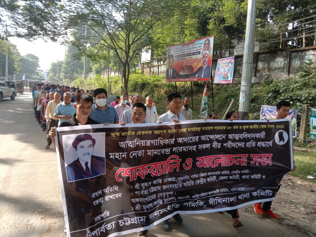 খাগড়াছড়ির দীঘিনালায় পার্বত্য চট্টগ্রাম জনসংহতি সমিতির প্রতিষ্ঠাতা মানবেন্দ্র নারায়ণ লারমার ৩৮তম মৃত্যুবার্ষিকী পালন করেছে এমএন লারমা সমর্থিত আঞ্চলিক সংগঠন জনসংহতি সমিতির। বুধবার সকাল সাড়ে ৮টায় দীঘিনালা উপজেলাস্থ বাসটার্মিনাল সংলগ্ন লারমা স্কয়ারে পার্বত্য জনসংহতি সমিতির কার্যালয়ের সামানে মানবেন্দ্র নারায়ণ লারমার স্মৃতিস্তম্ভে ফুল দিয়ে শ্রদ্ধা নিবেদন করেন সংগঠনের নেতাকর্মীরা। পরবর্তীতে মানবেন্দ্র নারায়ণ লারমা’র স্মরণে শোক র্যালি শেষে আলোচনা সভা অনুষ্ঠিত হয়।