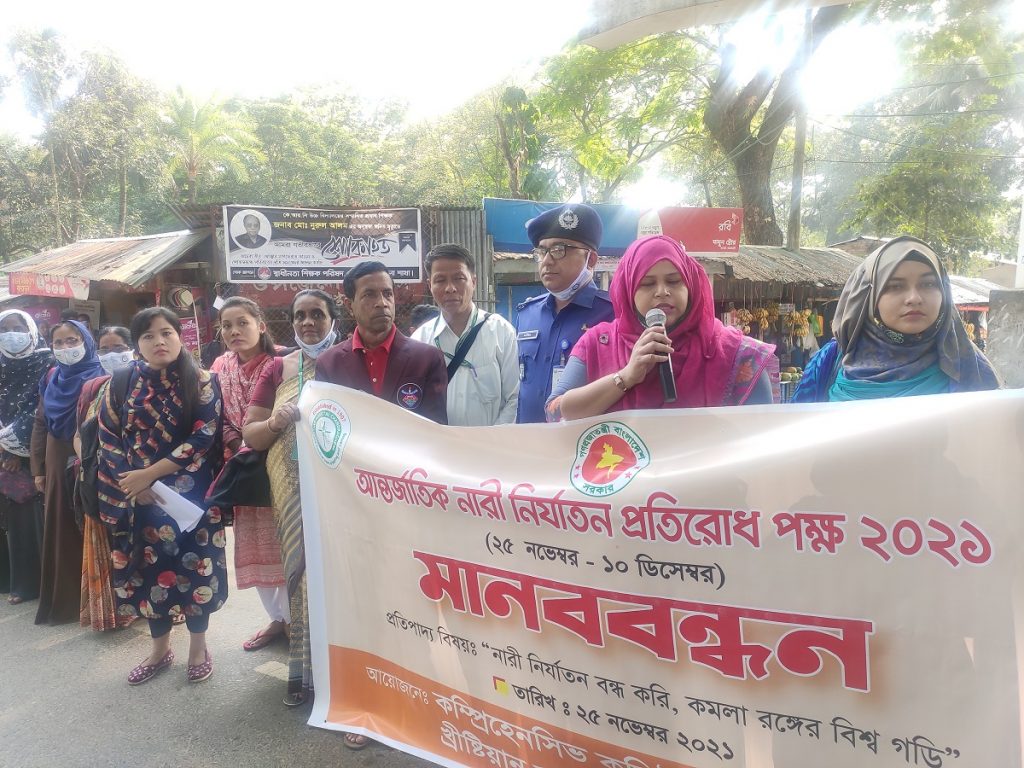 মানববন্ধনে টেকসই সামাজিক সেবা প্রদান প্রকল্প, কমিউনিটি হেলথ প্রোগামের স্বাস্থ্য কর্মী এবং বিভিন্ন উন্নয়ন সংস্থার সদস্যরা উপস্থিত ছিলেন।