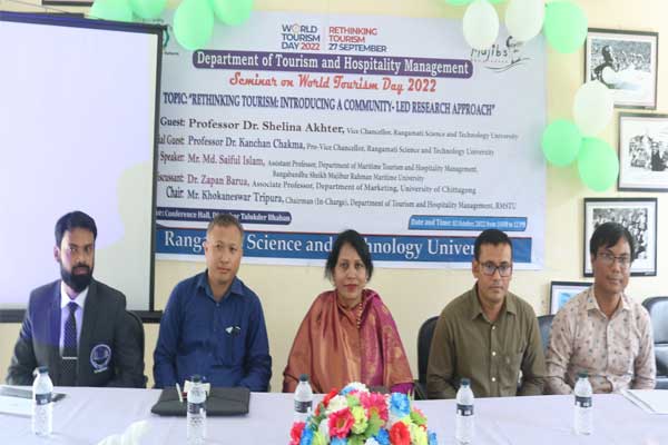 রাঙামাটি বিজ্ঞান ও প্রযুক্তি বিশ্ববিদ্যালয়ের ট্যুরিজম এন্ড হসপিটালিটি ম্যানেজমেন্ট বিভাগ কর্তৃক বিশ্ব পর্যটন দিবস উপলক্ষে সেমিনারের আয়োজন করেছে। সেমিনারে প্রধান অতিথি হিসেবে উপস্থিত ছিলেন বিশ্ববিদ্যালয়ের ভাইস-চ্যান্সেলর প্রফেসর ড. সেলিনা আখতার। বিশেষ অতিথি ছিলেন প্রো-ভাইস চ্যান্সেলর প্রফেসর ড. কাঞ্চন চাকমা। সেমিনারে মূল প্রবন্ধ উপস্থাপন করেন বঙ্গবন্ধু শেখ মুজিবুর রহমান মেরিটাইম বিশ্ববিদ্যালয়ের মেরিটাইম ট্যুরিজম এন্ড হসপিটালিটি ম্যানেজমেন্ট বিভাগের সহকারী অধ্যাপক মো. সাইফুল ইসলাম। তিনি কমিউনিটি বেইজড ট্যুরিজম গবেষণায় কিভাবে স্থানীয় জনগোষ্ঠীকে সম্পৃক্ত করা যায় তা নিয়ে প্রবন্ধ উপস্থাপন করেন।