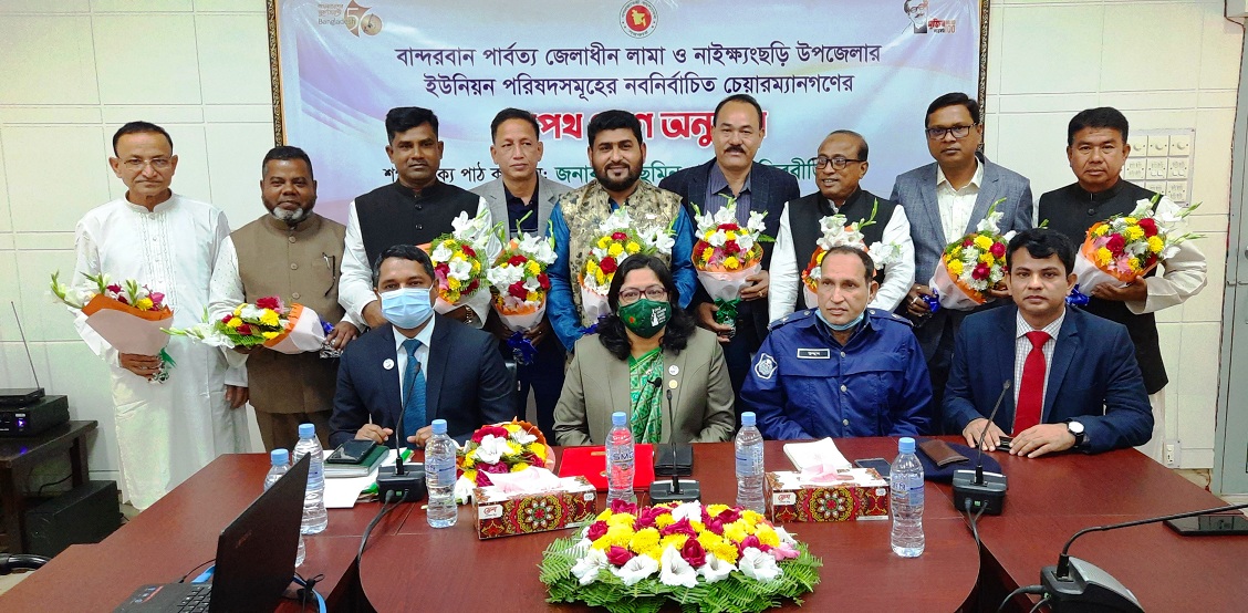 বান্দরবানের লামা ও নাইক্ষ্যংছড়ি উপজেলায় ইউনিয়ন পরিষদের নবনির্বাচিত চেয়ারম্যানদের শপথ গ্রহণ অনুষ্ঠিত হয়েছে। রবিবার সকালে বান্দরবান জেলা প্রশাসকের সভাকক্ষে এই শপথ গ্রহণ অনুষ্ঠিত হয়। এসময় বান্দরবানের জেলা প্রশাসক ইয়াছমিন পারভীন তিবরীজি প্রধান অতিথি হিসেবে উপস্থিত থেকে নবনির্বাচিত চেয়ারম্যানদের শপথ বাক্য পাঠ করান।