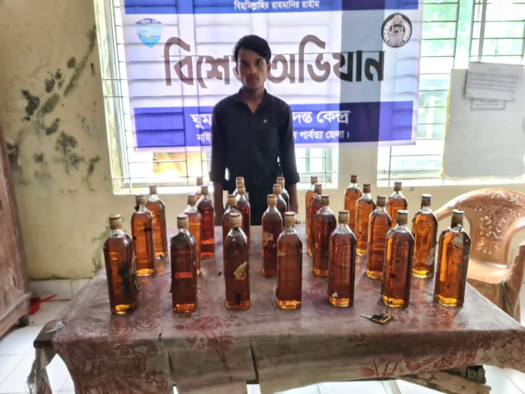 আইনশৃংখলা বাহিনী ও স্থানীয়রা জানায়, বান্দরবান জেলার নাইক্ষ্যংছড়ি উপজেলার মিয়ানমার সীমান্তবর্তী ঘুমধুম ইউনিয়নে ব্যাটারি চালিত একটি অটোরিকশা চালককে আটক করে। এসময় তার কাছ থেকে ২৬টি বিদেশি মদের বোতল জব্দ করে। এসময় অটোরিকশাও উদ্ধার করেছে পুলিশ। আটক ব্যক্তির নাম মো. নাছির উদ্দিন (২০)। তারবাড়ি কক্সবাজারের মহেশখালী এলাকায়।