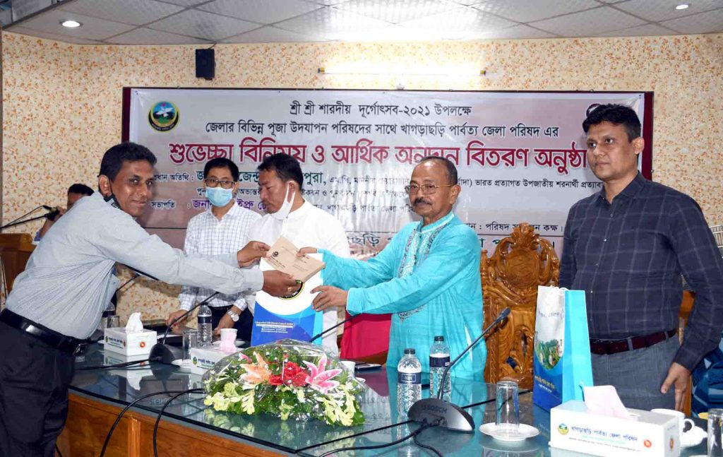 পরে এতে খাগড়াছড়ির নয় উপজেলার মোট ৫৫টি পূজা মণ্ডপের প্রতিটিতে ১০ হাজার টাকা করে ৫ লাখ ৫০ হাজার টাকা তুলে প্রধান অতিথিসহ আগতরা। প্রতিটি মণ্ডপের পুরোহিত ও সহকারী পুরোহিত পরিদীয় বস্ত্রও তুলে দেওয়া হয় এসময়।
