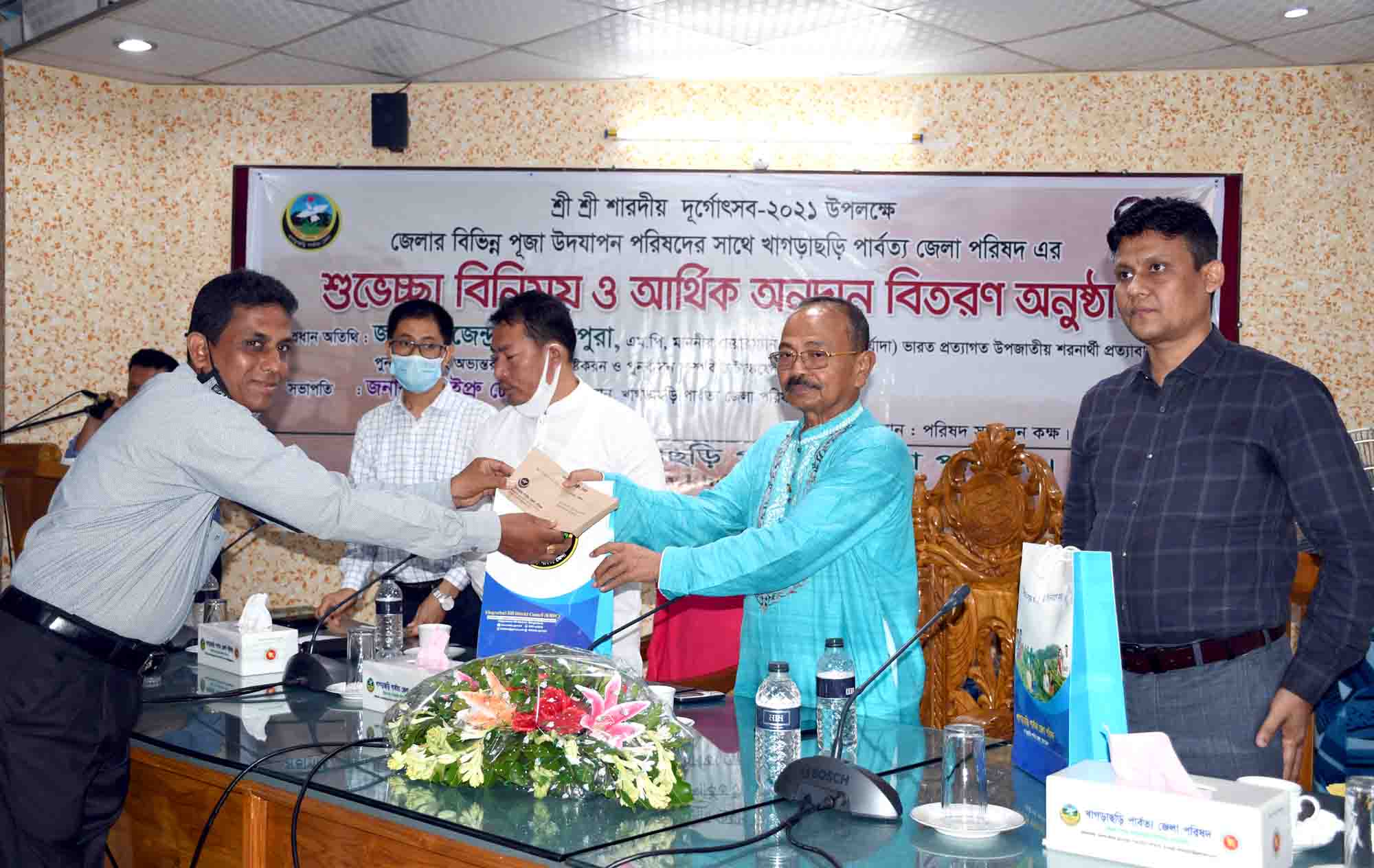হিন্দু সম্প্রদায়ের সবচেয়ে বড় ধর্মীয় উৎসব শারদীয় দুর্গোৎসব উপলক্ষে পূজা উদযাপন পরিষদের সঙ্গে শুভেচ্ছা বিনিময় ও আর্থিক অনুদান বিতরণ করেছে খাগড়াছড়ি পার্বত্য জেলা পরিষদ। সোমবার দুপুরে জেলা পরিষদ সম্মেলন কক্ষে শুভেচ্ছা বিনিময় ও আর্থিক অনুদান বিতরণ অনুষ্ঠানে প্রধান অতিথি ছিলেন ভারত প্রত্যাগত শরণার্থীবিষয়ক টাস্কফোর্স চেয়ারম্যান কুজেন্দ্র লাল ত্রিপুরা এমপি।