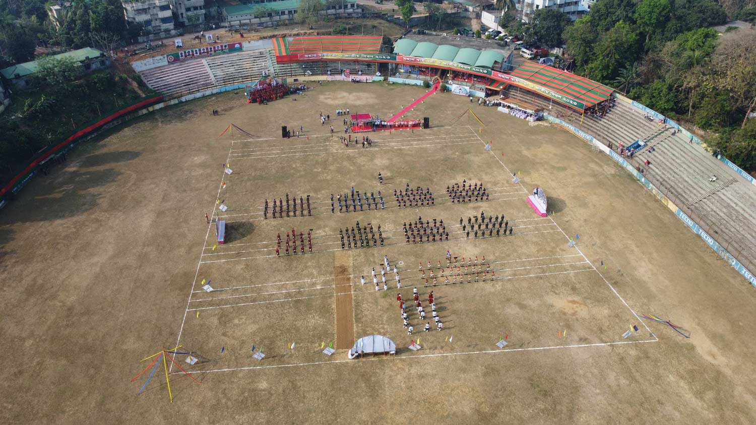 সকাল আটটায় চিং হ্লা মং মারী স্টেডিয়ামে শতকণ্ঠে জাতীয় সংঙ্গীতের মাধ্যমে পতাকা উত্তোলণ করা হয়। বেলুন পায়রা উড়িয়ে কুচকাওয়াজ এর অনুষ্ঠিতা শুরু হয়। কুচকাওয়াজে অংশ নেয় জেলা পুলিশ, আমর্ড পুলিশ ব্যাটালিয়ন, আনসার, ফায়ার সার্ভিস ও বিএনসিসি। এতে সালাম গ্রহণ করেন রাঙামাটির জেলা প্রশাসক মো. মিজানুর রহমান, পুলিশ সুপার মীর আবু তৌহিদ।