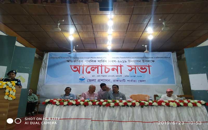 আন্তর্জাতিক পাবলিক সার্ভিস দিবসের আলোচনা সভায় প্রধান অতিথি ছিলেন ভারপ্রাপ্ত জেলা প্রশাসক এস এম শফি কামাল। এতে এএসপি মো. মাঈন উদ্দিন, কৃষি সম্প্রসারণ অধিদপ্তরের উপ-পরিচালক পবন কুমার চাকমা, মাধ্যমিক শিক্ষা কর্মকর্তা উত্তম খীসা, রাঙামাটির প্রবীণ সাংবাদিক সুনীল কান্তি দেসহ সরকারি বিভিন্ন অফিসের কর্মকর্তা ও কর্মচারী উপস্থিত ছিল।