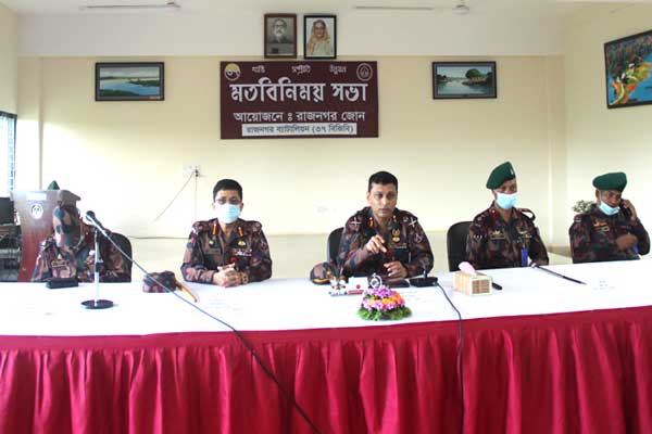 গত রোববার সকালে রাজনগর (৩৭ বিজিবি) জোনের মিলনায়তনে আয়োজিত মতবিনিময় সভায় বিজিবি রাঙামাটি সেক্টর কমান্ডার কর্নেল সাহীদুর রহমান ওসমানীর সভাপতিত্বে মতবিনিময় সভায় উপস্থিত ছিলেন রাজনগর (৩৭বিজিবি) জোন কমান্ডার লে. কর্নেল মো. সেলিম আলদীন, জোন উপ-অধিনায়ক মেজর মো. নুরুল ইসলাম খাঁনসহ অন্যান্য বিজিবি কর্মকর্তাগণ। এসময় অন্যান্যদের মধ্যে বক্তব্য রাখেন, রাঙামাটি পার্বত্য জেলা পরিষদ সদস্য আব্দুর রহিম, লংগদু উপজেলা পরিষদের ভাইস চেয়ারম্যান সিরাজুল ইসলাম ঝান্টু, গুলসাখালী ইউনিয়ন পরিষদ (ইউপি) চেয়ারম্যান আবু নাছির, আমতলী ইউনিয়ন পরিষদ (ইউপি) চেয়ারম্যান রাসেল চৌধুরী প্রমুখ।