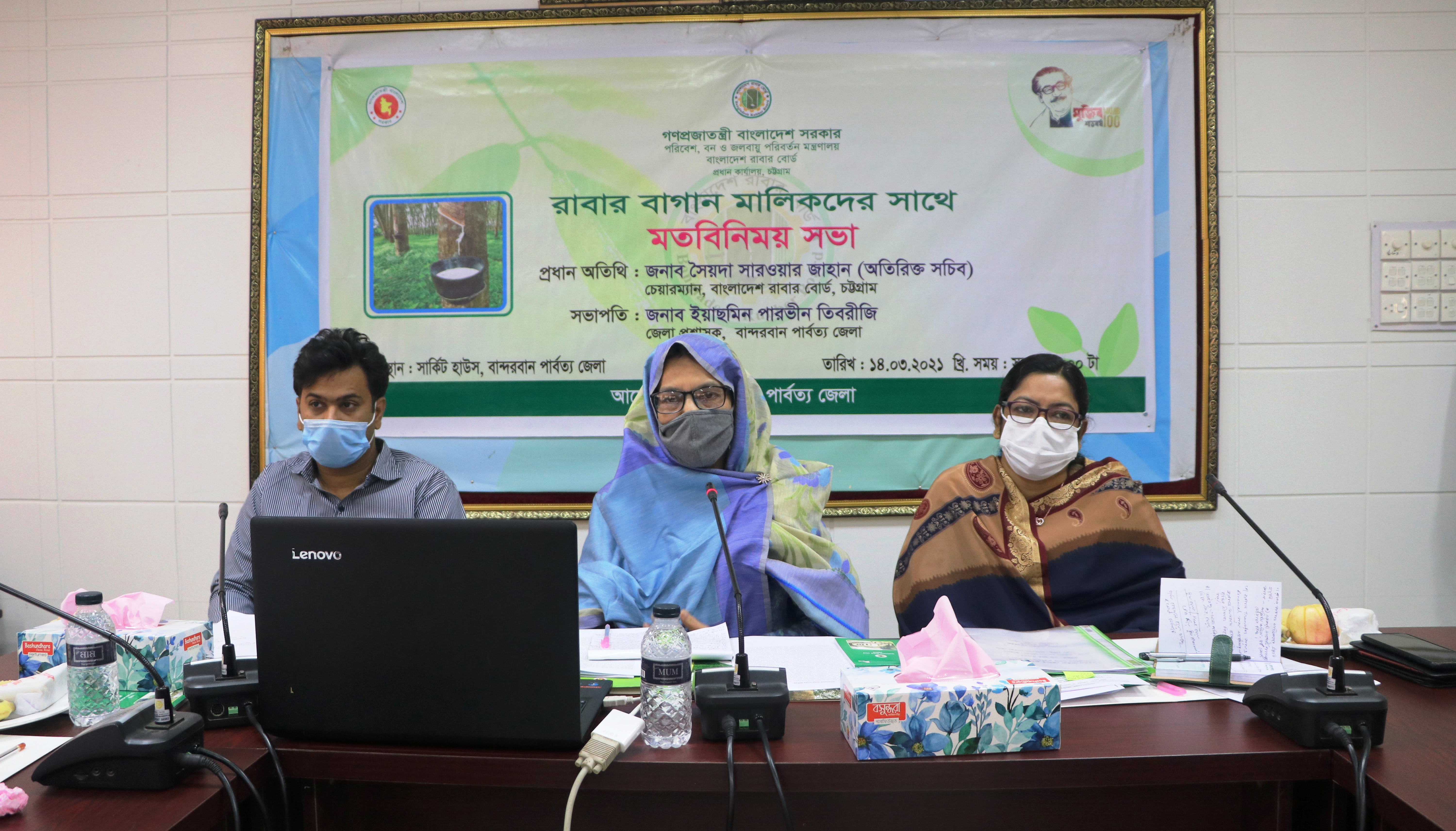 সভায় সভাপতির বক্তব্য রাখতে গিয়ে বান্দরবানের জেলা প্রশাসক ইয়াছমিন পারভীন তিবরীজি বলেন,বান্দরবানের বিভিন্ন উপজেলায় রাবার চাষ শুরু হয়েছে বহু বছর আগে থেকে আর বান্দরবানের উৎপাদিত রাবার দেশের বিভিন্ন প্রান্তে পৌঁছে গিয়ে বিভিন্ন নিত্যনতুন জিনিস তৈরি করা হচ্ছে। এসময় জেলা প্রশাসক রাবার ব্যবসায়ীদের আরো দায়িত্বশীল হয়ে রাবার চাষ ও রাবার বিক্রির সাথে জড়িত হয়ে দেশের অর্থনীতির গতিকে আরো সমৃদ্ধ করার আহবান জানান এবং জেলা প্রশাসন থেকে সার্বিক সহযোগিতা প্রদান করার আশ্বাস দেন।