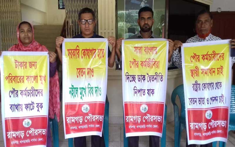 রাষ্ট্রীয় কোষাগার থেকে পৌরসভার কর্মকর্তা-কর্মচারীদের শতভাগ বেতন-ভাতা প্রদানসহ পেনশন প্রথা চালু ও জনপ্রতিনিধিদের সম্মানি ভাতা প্রদানের দাবিতে খাগড়াছড়ির রামগড় পৌরসভার সম্মুখে অবস্থান কর্মসূচী পালন করছেন এখানে কর্মরত কর্মকর্তা-কর্মচারীবৃন্দ। ১ জুলাই সোমবার সকাল ৯টা থেকে বিকাল ৫টা পর্যন্ত এই চলমান কার্যক্রমের সময় নাগরিক সেবা প্রদান থেকে বিরত আছেন সংশ্লিষ্ট কর্মকর্তা ও কর্মচারীরা।