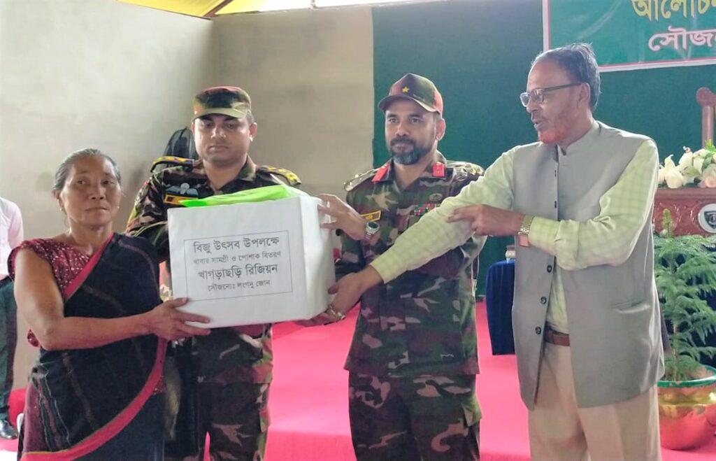 পার্বত্য চট্টগ্রামের ক্ষুদ্র নৃগোষ্ঠীদের প্রধান সামাজিক উৎসব বৈসাবি উপলক্ষে শতাধিক দরিদ্র পরিবারকে বিজু উপহার প্রদান করেছে খাগড়াছড়ি রিজিয়ন কমান্ডার ব্রিগেডিয়ার গোলাম মহিউদ্দিন আহামেদ। মঙ্গলবার সকালে সেনাবাহিনীর লংগদু জোনে এই উপহার সামগ্রী বিতরণ করা হয়।