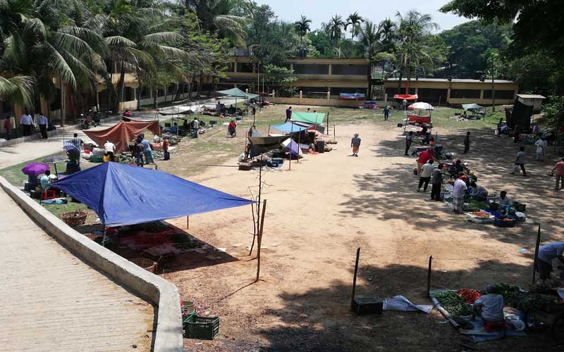 মঙ্গলবার সকাল থেকে দুটি বাজার ওই স্কুল মাঠেই ‘সামাজিক দূরত্ব’ বজায় রেখেই বেচা কেনা শুরু হয়।
